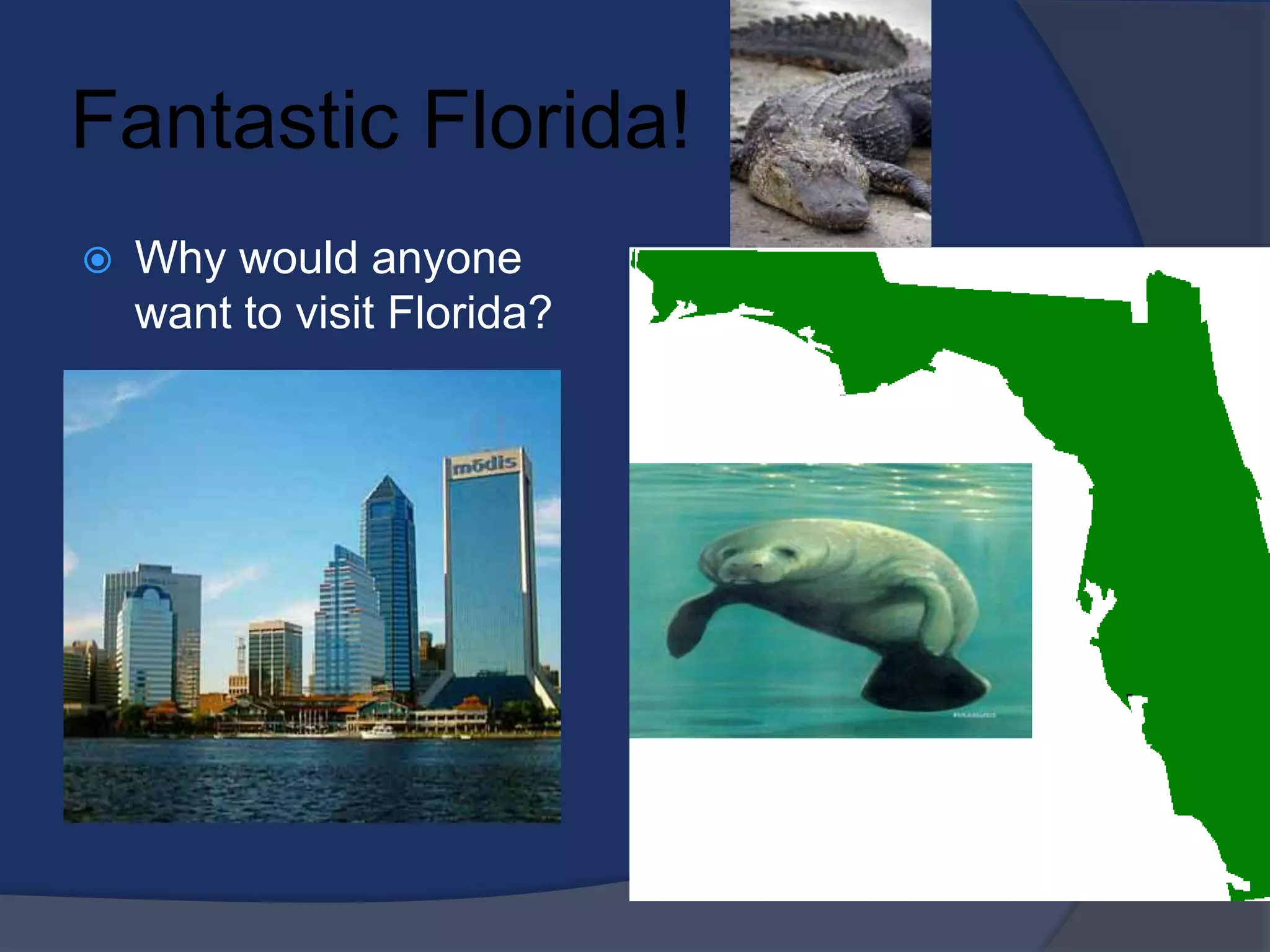 Florida has a warm climate year-round and produces oranges and grapefruit. It has many lakes and hurricanes in the summer. Important historical events include Florida's role in World War 2 and famous Floridian Jacqueline Cochran. Popular tourist destinations are the Kennedy Space Center, Walt Disney World, and cities like Cape Canaveral and the capital Tallahassee. Florida is known for its universities where Gatorade was invented and has many resources for learning more about its industries, people, and places.