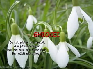 Documentul descrie diverse flori de primăvară, incluzând ghiocelul, laleaua, narcisa, panseluța, zambila, liliacul, frezia, toporașul, lăcrămioara și stânjenelul, evidențiind caracteristicile lor botanice, zonele de origine, modul de înflorire și simbolistica aferentă. Fiecare floare este asociată cu o legendă și este apreciată atât pentru frumusețea ei, cât și pentru proprietățile terapeutice. De asemenea, multe dintre aceste flori simbolizează teme precum speranța, prietenia, fertilitatea și dragostea neîmpărtășită.