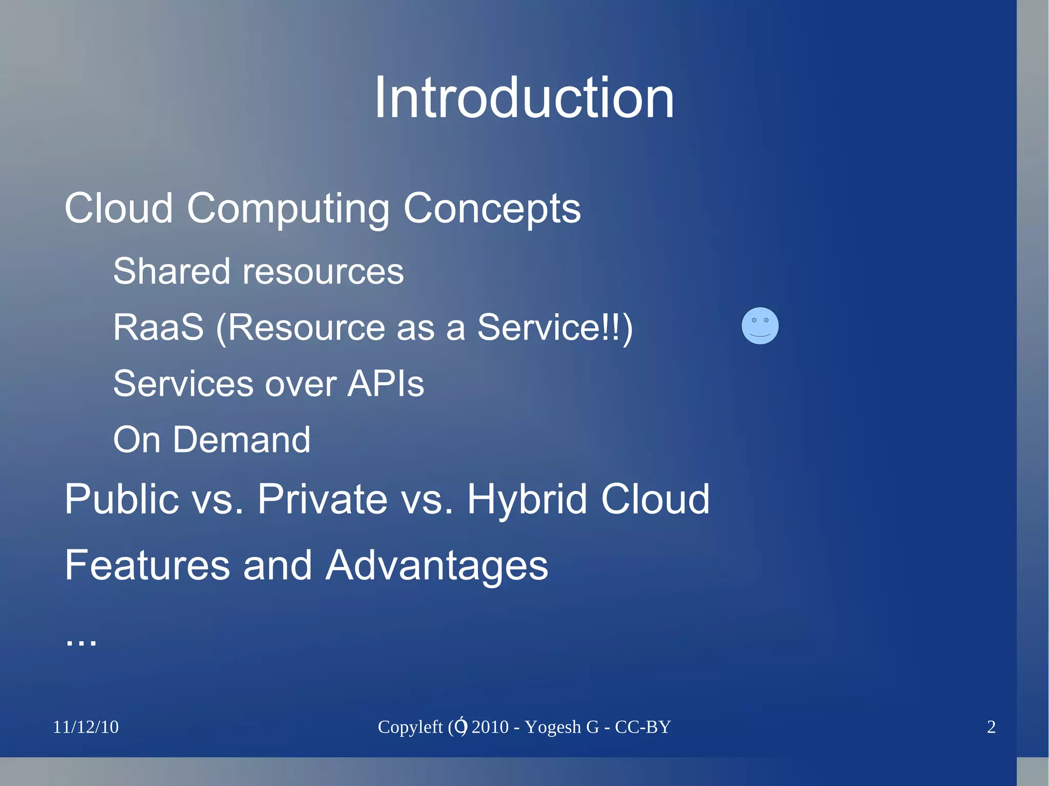 The document provides an overview of open-source cloud computing concepts, discussing various services, architectures, and components like Eucalyptus and OpenStack. It highlights features, advantages, and key components such as storage controllers, load balancers, and security measures. The content also references additional resources for further reading on related technologies.