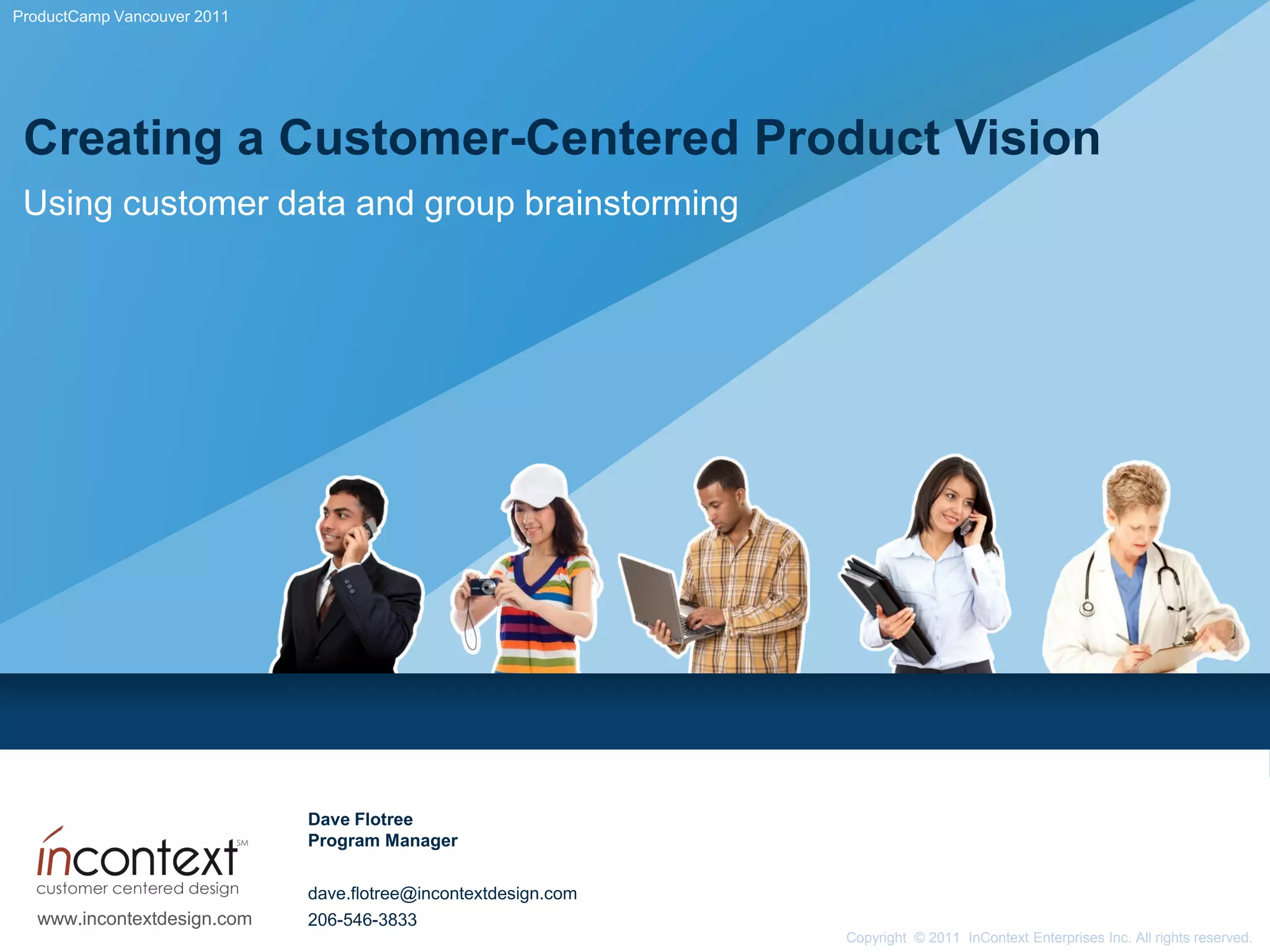 This document summarizes a workshop on creating customer-centered product visions using contextual design. The workshop will have participants analyze customer data to understand user needs and issues, then brainstorm ideas for addressing those needs. Participants will develop multiple visions for how new technologies could improve the customer experience. They will evaluate the visions and consolidate them into a coherent solution. The goal is to redesign products and services around customer needs revealed by contextual inquiry research methods.