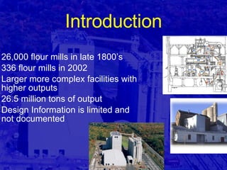 This document discusses key considerations for planning and life safety in flour milling facilities. It covers regulatory codes around occupancy, construction type, height and area restrictions. Grain storage, cleaning towers, tempering bins and mills often use slipformed concrete construction. The document outlines the flour milling process and notes facilities must plan for flexible layouts and changing technology. Life safety focuses on OSHA, FDA, NFPA codes around equipment access, building envelope, fire protection and loads in mill structures. Sanitary construction aims to allow durable, cleanable surfaces throughout facilities.