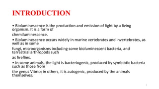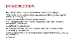 The document discusses bioluminescence, a phenomenon where living organisms produce light through chemical reactions, and it is prevalent in marine environments as well as in some terrestrial species. It also addresses fluorescence and phosphorescence, explaining their mechanisms, applications in various fields, and differences between them. Additionally, it highlights the historical background and discoveries related to these light-emitting processes.