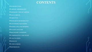 The document presents a computational fluid dynamics analysis of flow over NACA airfoils using ANSYS Fluent. It describes modeling NACA-4412, NACA-6409, and NACA-0012 airfoils, applying boundary conditions, and analyzing lift, drag, velocity and pressure distributions. The analysis found that NACA-4412 had a higher lift-to-drag ratio than NACA-6409. Additionally, increasing the angle of attack was found to initially increase lift and drag coefficients until a certain point, after which lift decreased while drag continued increasing.