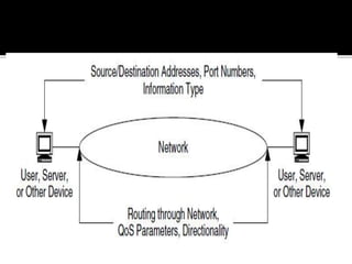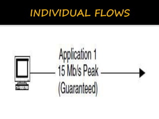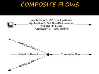 This document discusses network flows and flow analysis. It defines flows as sequences of packets sent from a source to a destination. Flow analysis describes and characterizes traffic flows by identifying where they occur and what performance they require. Flows can be individual, representing a single application, or composite, representing the combination of requirements from multiple applications sharing a network. Flow models help categorize flows based on environment type. Prioritizing flows determines which get more resources based on importance factors.