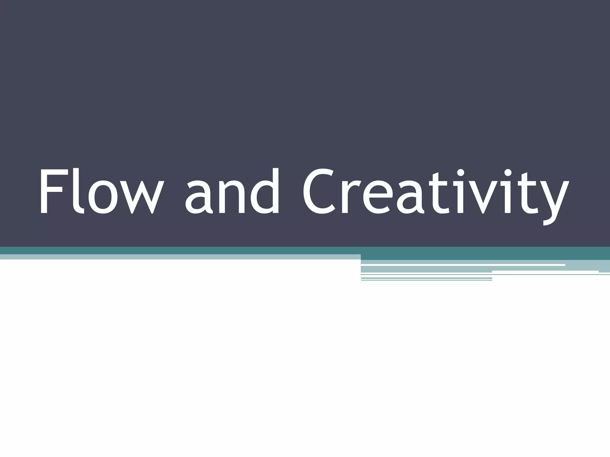 The document discusses flow and creativity. It defines flow as a mental state of full focus and enjoyment during an activity that provides appropriate challenge. Flow allows people to enter a state of focused concentration without self-consciousness. Certain personality traits are associated with experiencing flow more regularly. The document also discusses how flow relates to well-being, growth, and confidence. It notes that creativity involves generating original and valuable ideas, and provides strategies for nurturing creativity. The creative process involves preparation, incubation, illumination, and evaluation/implementation of ideas. Highly creative individuals tend to be curious, willing to take risks, and intellectually playful. Benefits of creativity include self-actualization, resilience, and enhanced well-being.
