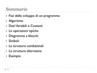 Il documento descrive le fasi dello sviluppo di un programma, dall'analisi del problema fino al testing del software. Viene illustrato il concetto di algoritmo e diagrammi a blocchi, esemplificando attraverso la preparazione del caffè e introducendo variabili e operazioni tipiche. Inoltre, si approfondiscono le strutture condizionali e alternative necessarie per la logica algoritmica.