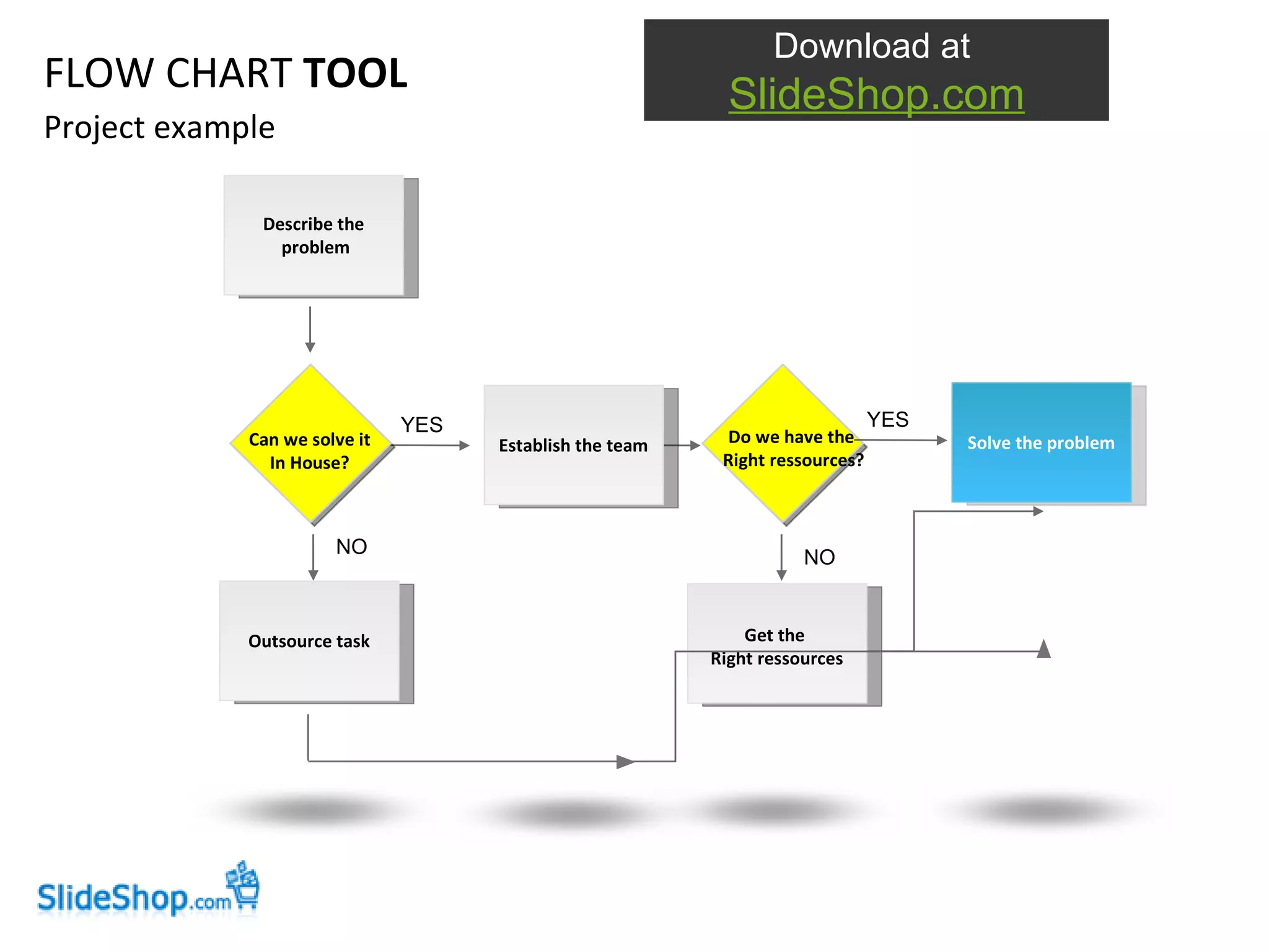 The document discusses the use of a flow chart tool for solving project-related problems, including team establishment and resource allocation. It highlights the customization options of the tool, such as recoloring and resizing diagrams, along with example texts. Additionally, it provides information on customer support options, including email and phone support for assistance.