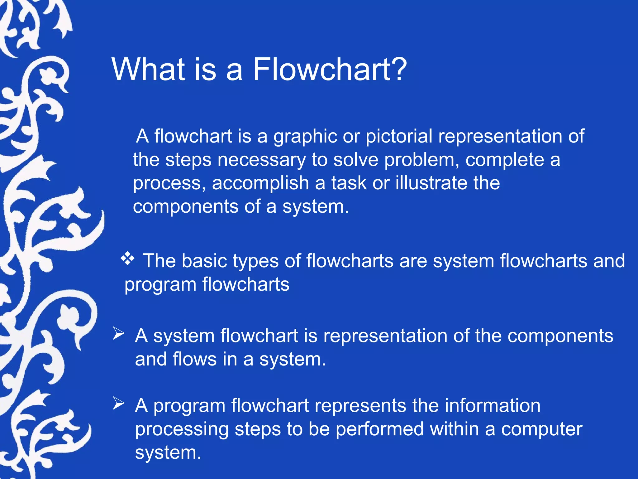 A flowchart is a visual representation of steps to solve problems, complete tasks, or illustrate system components, primarily used in programming and process documentation. It employs various symbols to represent processes, inputs, outputs, and decisions, offering a clear and concise overview of logic flows. Despite a decline in use with the rise of object-oriented programming, flowcharts remain valuable for modeling complex logic and documenting processes.