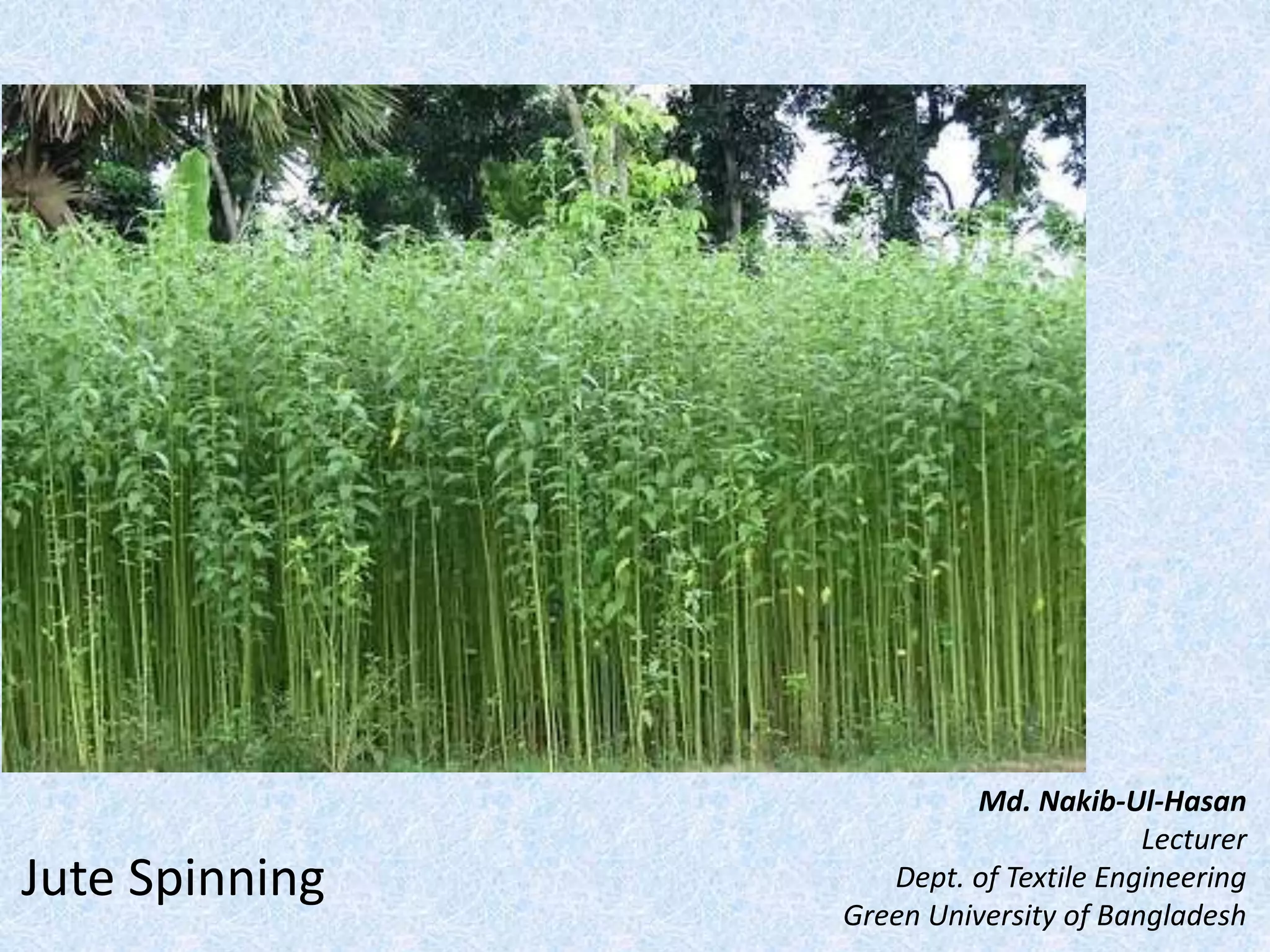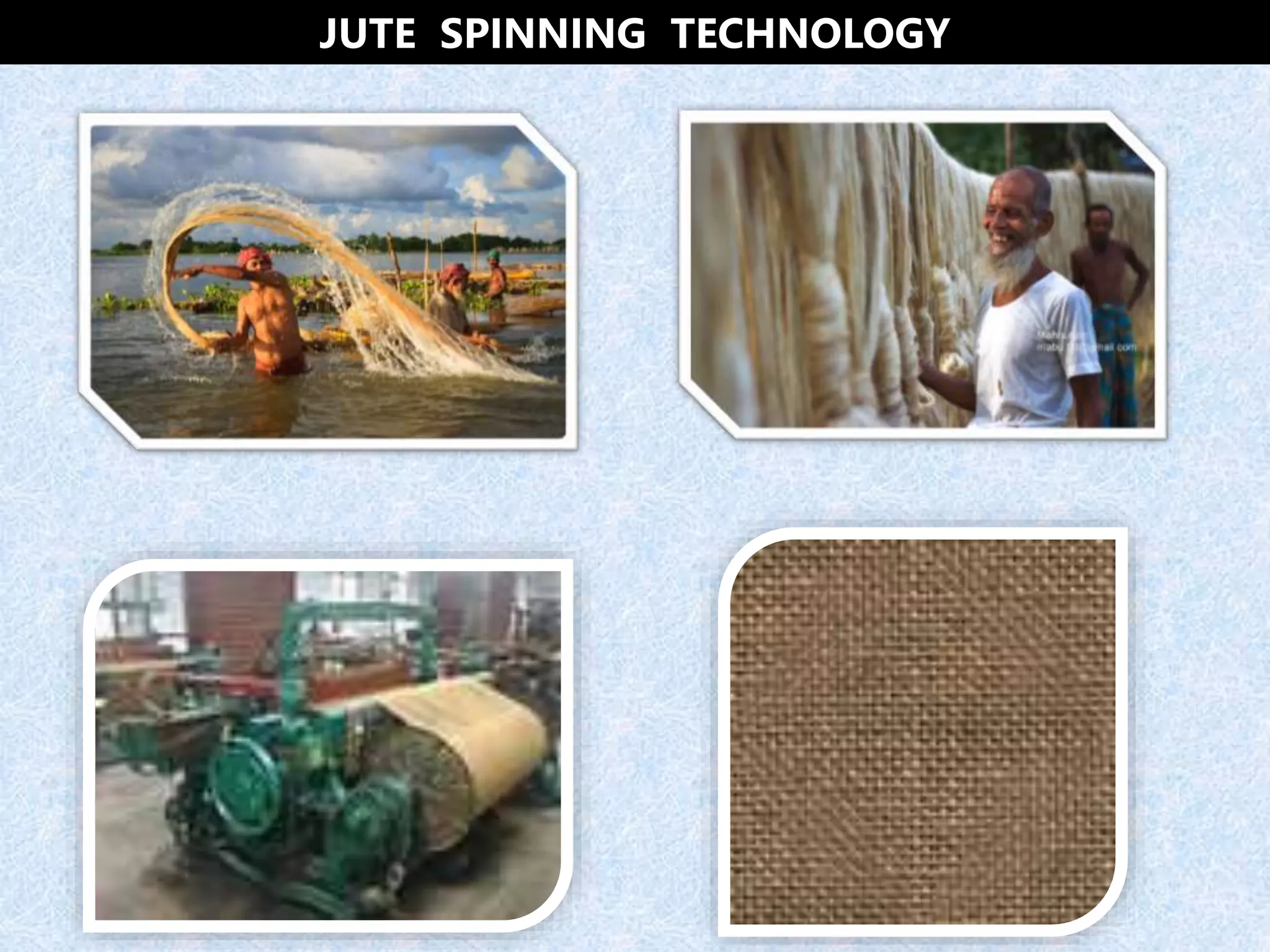 This document provides information about jute spinning technology. It discusses that jute is a soft vegetable fiber that can be spun into coarse threads. Raw jute bales are processed in jute mills to produce products like hessian, sacking, and jute yarn. It also describes the characteristics of jute fiber and provides details about various stages of jute processing like batching, softening, carding, drawing, and winding.
