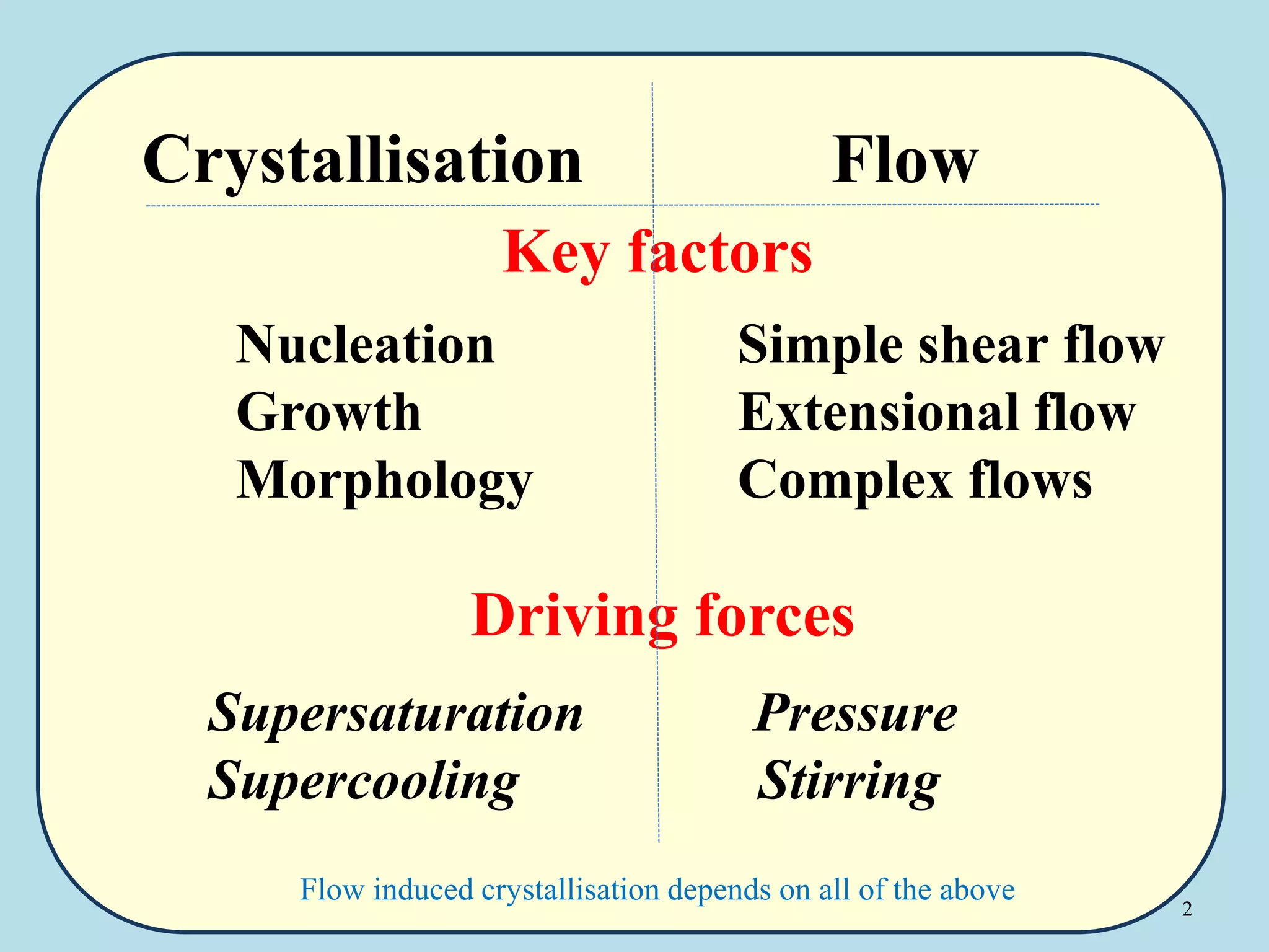 The document discusses the principles of crystallization and flow processing, emphasizing the impact of various flow types on crystallization, particularly for polyethylene. It outlines key concepts such as shear and extensional flow, crystallization mechanisms, and methods for achieving plug flow in continuous systems. Additionally, advancements like oscillatory flow mixing and microcapillary films are highlighted as innovative approaches to enhance crystallization efficiency and control in industrial applications.