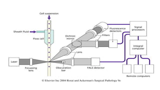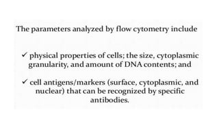 Flow cytometry is a technique that uses lasers to illuminate single cell suspensions labeled with fluorescent markers as they flow through the instrument, generating signals from scattered and fluorescent light that can identify cell subsets and characteristics and be analyzed by computer to provide diagnostic information about cell populations. A flow cytometer consists of fluidic, optical, and electronic systems to transport cells to the laser beam, direct resulting light signals to detectors, and convert those signals into electronic data for analysis. Flow cytometry can identify cell types using fluorescent antibodies targeting antigens, analyze DNA content to detect cancer cell abnormalities, and examine the cell cycle to determine proliferation rates of malignant cells.