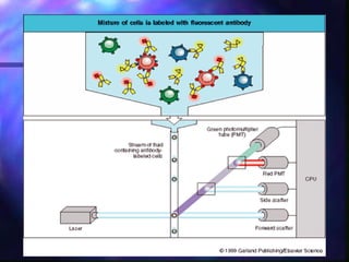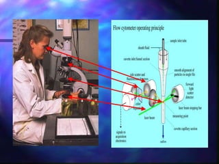 The document provides an overview of the basic principles and components of flow cytometry. It discusses how flow cytometry works by measuring the properties of cells in fluid flow, using a combination of fluidics to introduce cells, optics to generate and collect light signals, and electronics to convert signals to digital data. Key aspects summarized include how cells are hydrodynamically focused and interrogated by light scatter and fluorescence to derive information on their size, granularity, and marker expression that can be analyzed using software.