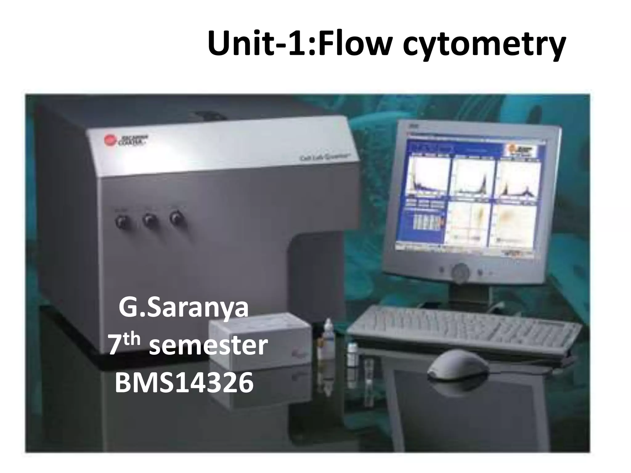 This document discusses flow cytometry, which measures properties of cells as they flow through a fluid stream. It describes the principles and components of a flow cytometer, including the flow system that orders cells into a single-file stream, the optical system that illuminates cells and detects light scattering/fluorescence, and the electronic system that converts signals to digital data. The document outlines how flow cytometry is used to analyze physical/antigen characteristics of cells and identifies different cell types. It provides examples of clinical applications like leukemia diagnosis and CD4 counting in HIV/AIDS.