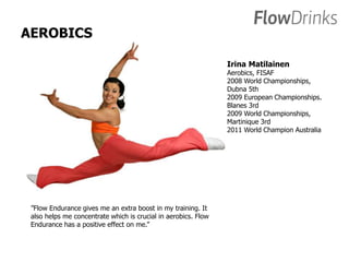 The document provides testimonials and performance improvements attributed to Flow endurance drinks from various athletes across different sports, including aerobics, basketball, golf, and more. Many users highlight enhanced concentration, sustained energy, and hydration benefits that contribute to their competitive success. Additionally, coaches and trainers recognize Flow as a valuable nutritional supplement for optimal athletic performance.