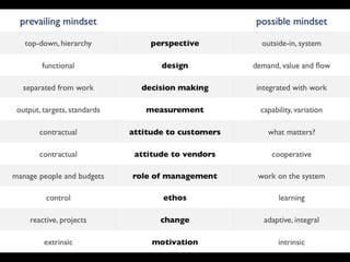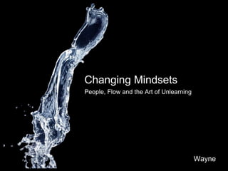 The document discusses the challenges of changing mindsets within organizations, particularly regarding resource and flow efficiency. It highlights the resistance to adopting new methodologies, such as Agile, especially in environments committed to traditional processes like Waterfall. Additionally, it explores unlearning techniques to encourage creativity and adaptability among employees to improve overall efficiency and satisfaction.