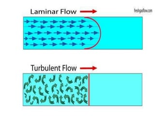 The document covers fluid flow principles, including fluid properties such as viscosity and hydrostatics, and delves into fluid dynamics with an emphasis on Bernoulli's theorem. It explains the different types of fluid flow—laminar and turbulent—and the factors affecting flow dynamics, such as Reynolds number. Important applications of these principles in fields such as pharmacology and engineering are also highlighted.