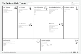 The document outlines key aspects of a business model such as value propositions, customer segments, channels, and revenue streams. It discusses delivering value to customers through facilitating creative expression and public discussion via both physical spaces and online platforms. The business aims to satisfy customer needs like normalized consumers and alienated outsiders by helping facilitate random expressive flows and journeys.