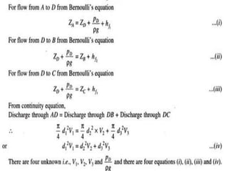 This document discusses the analysis of branching pipe systems, which connect three or more reservoirs by pipes with one or more junctions. It explains that the goal is to determine discharge in the pipes given their diameters, lengths, and friction coefficients. It also outlines the key equations used: continuity, Bernoulli's, and Darcy-Weisbach. The analysis assumes steady flow conditions and minor losses are negligible.