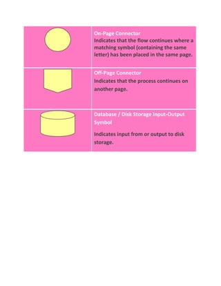 This document describes the basic symbols used in process flowcharts including the start/stop oval, action/process rectangle, decision diamond, input/output parallelogram, flow lines, on-page connector, off-page connector, and database/disk storage input-output symbol. It provides a brief explanation of what each symbol represents such as the start/stop oval marking the starting or ending point, the action/process rectangle representing a single step or sub-process, and the decision diamond indicating a branching point in the process.