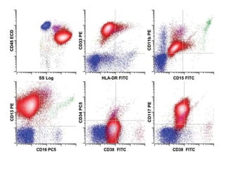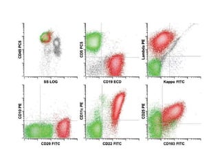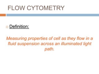 Flow cytometry allows for the quantitative and qualitative analysis of cell properties as cells flow in a fluid stream through a laser. Cells are labeled with fluorescent markers and pass through the laser one by one. Light scattering and fluorescence emission are converted to digital signals which can be analyzed as histograms or dot plots. Properties like cell size, granularity, and marker expression are measured. Gating allows analysis of specific cell populations. Flow cytometry has many applications including immunophenotyping, cell cycle analysis, and functional assays.