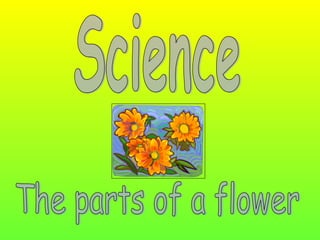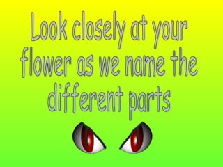 The document discusses plant and flower anatomy and reproduction. It explains that plants have roots, stems, leaves and flowers. Flowers contain male and female organs, and that seeds are formed when pollen from the male organ fertilizes the female organ. The document then prompts the reader to label different parts of a flower diagram.