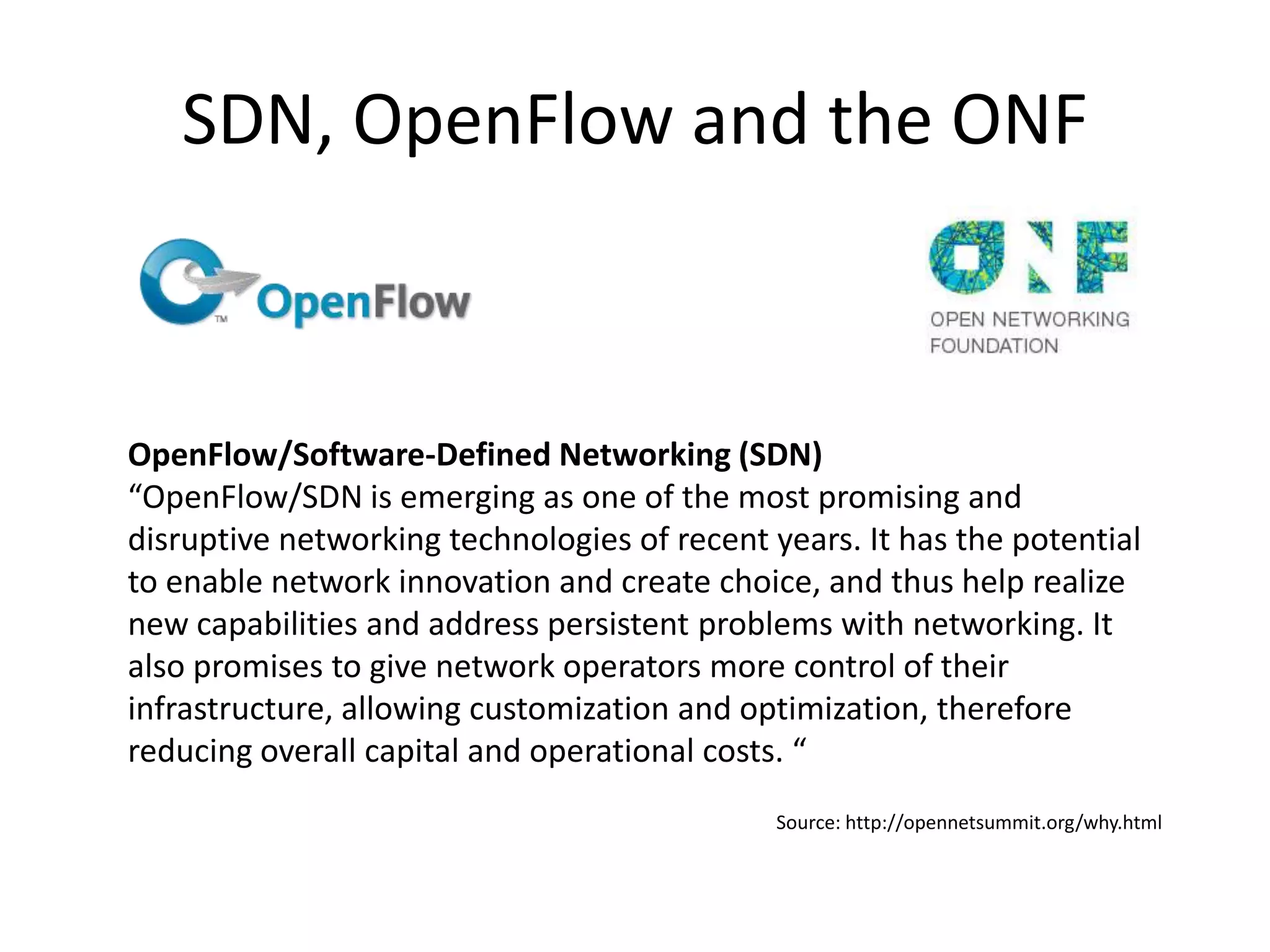 This document summarizes an article about SDN, OpenFlow, and the ONF. It discusses how OpenFlow and SDN are emerging technologies that have the potential to enable network innovation and optimize costs. It also introduces the Open Networking Foundation (ONF) and how the community around SDN and OpenFlow has grown rapidly.