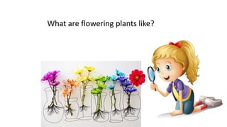 This document discusses flowering and non-flowering plants. It describes the parts of flowering plants including roots, stems, leaves, flowers and seeds. It explains that flowers produce fruits containing seeds to help plants reproduce. The life cycle of flowering plants is outlined as seeds growing into plants that grow flowers and fruits containing new seeds. Non-flowering plants like conifers produce cones instead of flowers that also contain fruits and seeds. Deciduous trees lose their leaves in autumn while evergreen trees keep their leaves year-round.