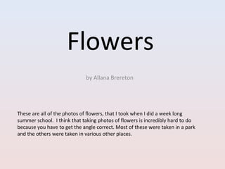 Flowers are photos that the author took during a summer school week. The author found photographing flowers difficult because getting the correct angle is challenging. Most photos were taken in a park, while others were captured in various other locations.