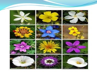 This document discusses different types of flowers that bloom in various seasons like spring, summer and winter. It notes that flowers have attractive colors and make fruits and seeds. It also provides examples of edible flowers and flowers used for cooking, relaxation, dyeing clothes and decoration. Some key facts mentioned include that roses, sunflower seeds and lavender have uses beyond aesthetics and that the largest flower is the titan arum which smells like decaying flesh.