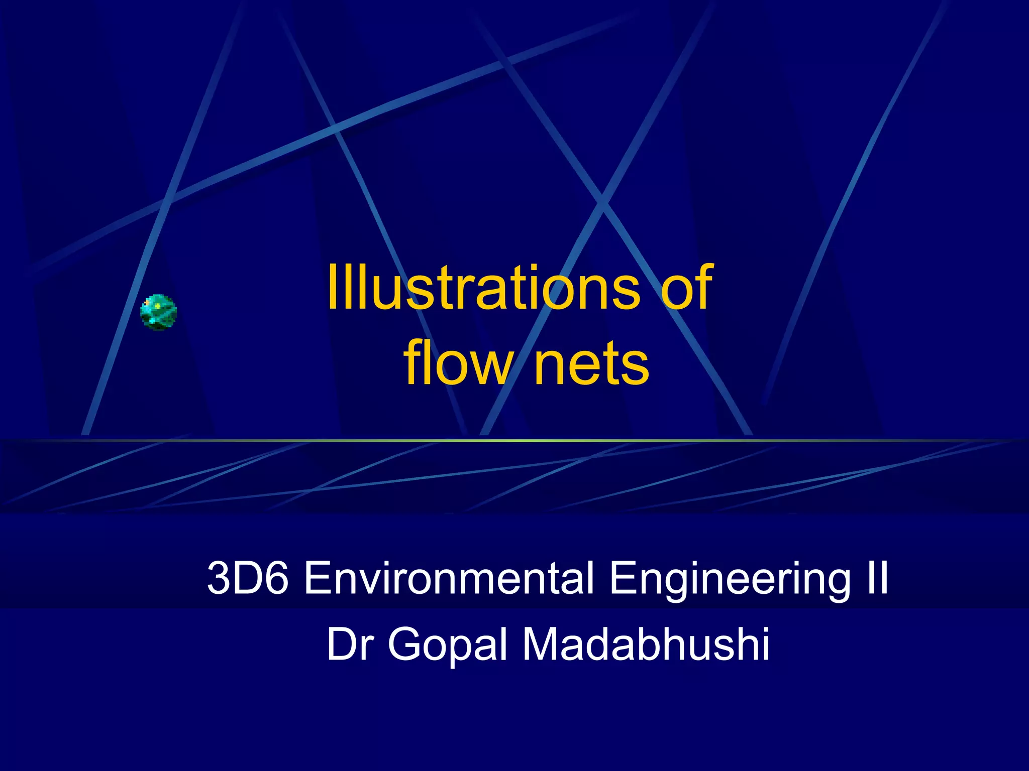 3. Examples of flow nets show flow through dams made of clay, sand and concrete, as well as flow around excavations supported by sheet piles.