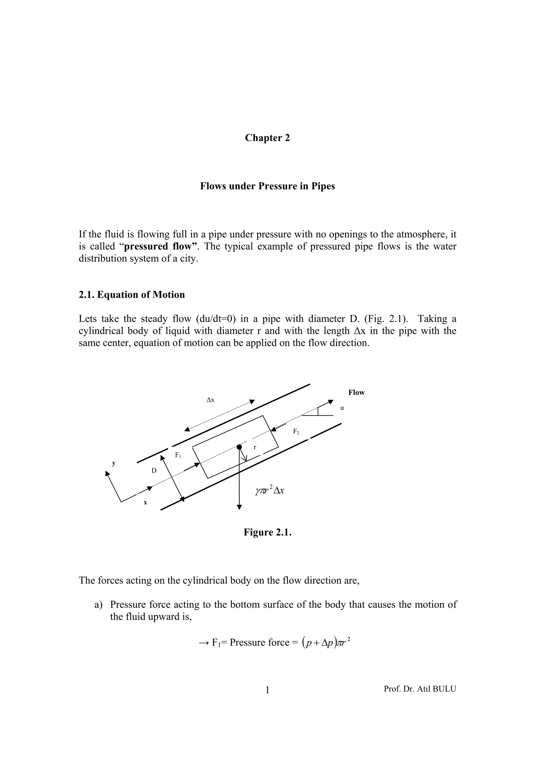 This document discusses fluid flow in pipes under pressure. It presents equations to describe laminar and turbulent flow. For laminar flow, the Hagen-Poiseuille equation gives the relationship between pressure drop and flow rate. For turbulent flow, the velocity profile consists of a thin viscous sublayer near the wall and a fully turbulent center zone. Equations are derived to describe velocity profiles in both the sublayer and center zone based on viscosity and turbulence effects. Pipes are classified as smooth or rough depending on roughness size compared to the sublayer thickness.