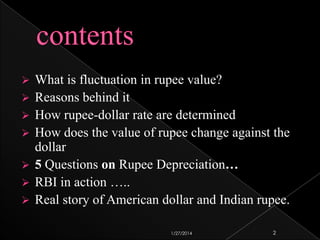 This document discusses factors that influence fluctuations in the value of the Indian rupee relative to other currencies like the US dollar. It explains that the rupee's value is determined by market forces of supply and demand. When demand for dollars is high due to imports, trade deficits, or investors taking money out of India, it puts downward pressure on the rupee. Conversely, higher exports or foreign investment inflows can strengthen the rupee by increasing its demand. The Reserve Bank of India also tries to manage volatility in the rupee's value by buying or selling dollars from its reserves.
