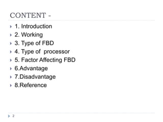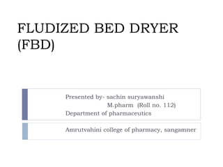 The document discusses fluidized bed drying (FBD), which uses hot air passed through granules in a container at high pressure to fluidize and dry the granules. There are two main types - batch and continuous. Batch types include vertical and rotating discharge dryers. Continuous dryers use a horizontal vibrating conveyor. Factors like particle size and density affect fluidization. FBD allows for shorter, more uniform drying times and protects thermolabile materials compared to other drying methods. However, it can cause particle attrition and electrostatic charging of some powders during drying.