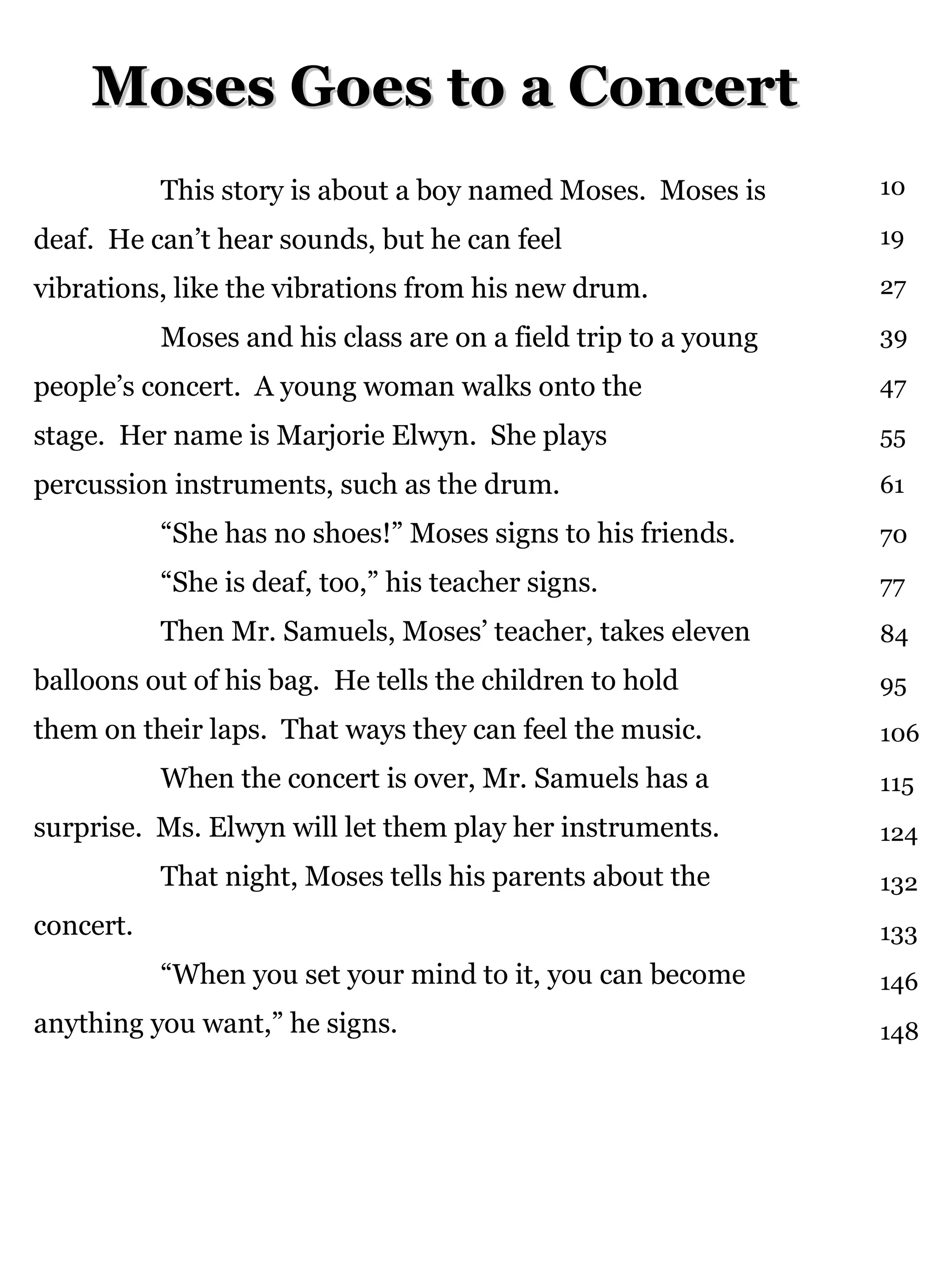 Moses, a deaf boy, goes on a field trip with his class to a young people's concert. At the concert, Moses learns that the percussionist, Marjorie Elwyn, is also deaf. His teacher hands out balloons so the children can feel the music. After the concert, Ms. Elwyn lets the class play her instruments. Moses tells his parents about the concert and how anyone can achieve their dreams if they set their mind to it.