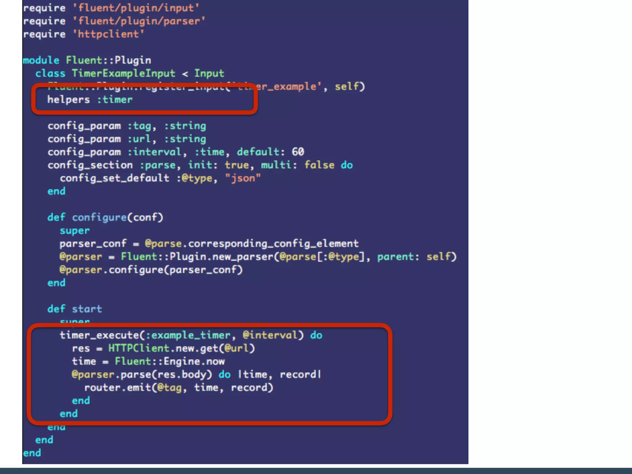 - The main plugin classes are Input, Filter, Output, Buffer, and plugins must subclass Fluent::Plugin::Base.
