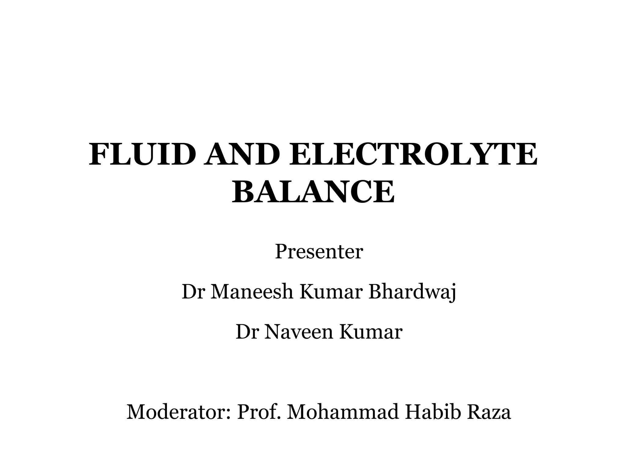 1) Fluid and electrolyte balance is essential for human health and involves complex regulation of water and electrolytes like sodium and potassium in the body.
