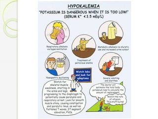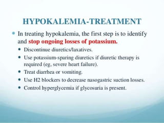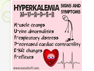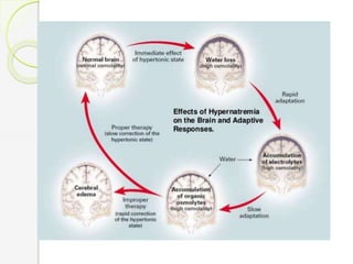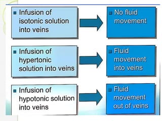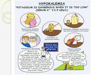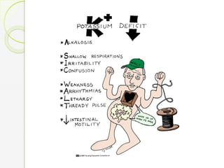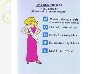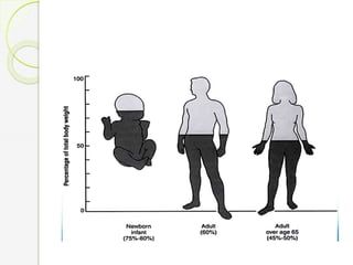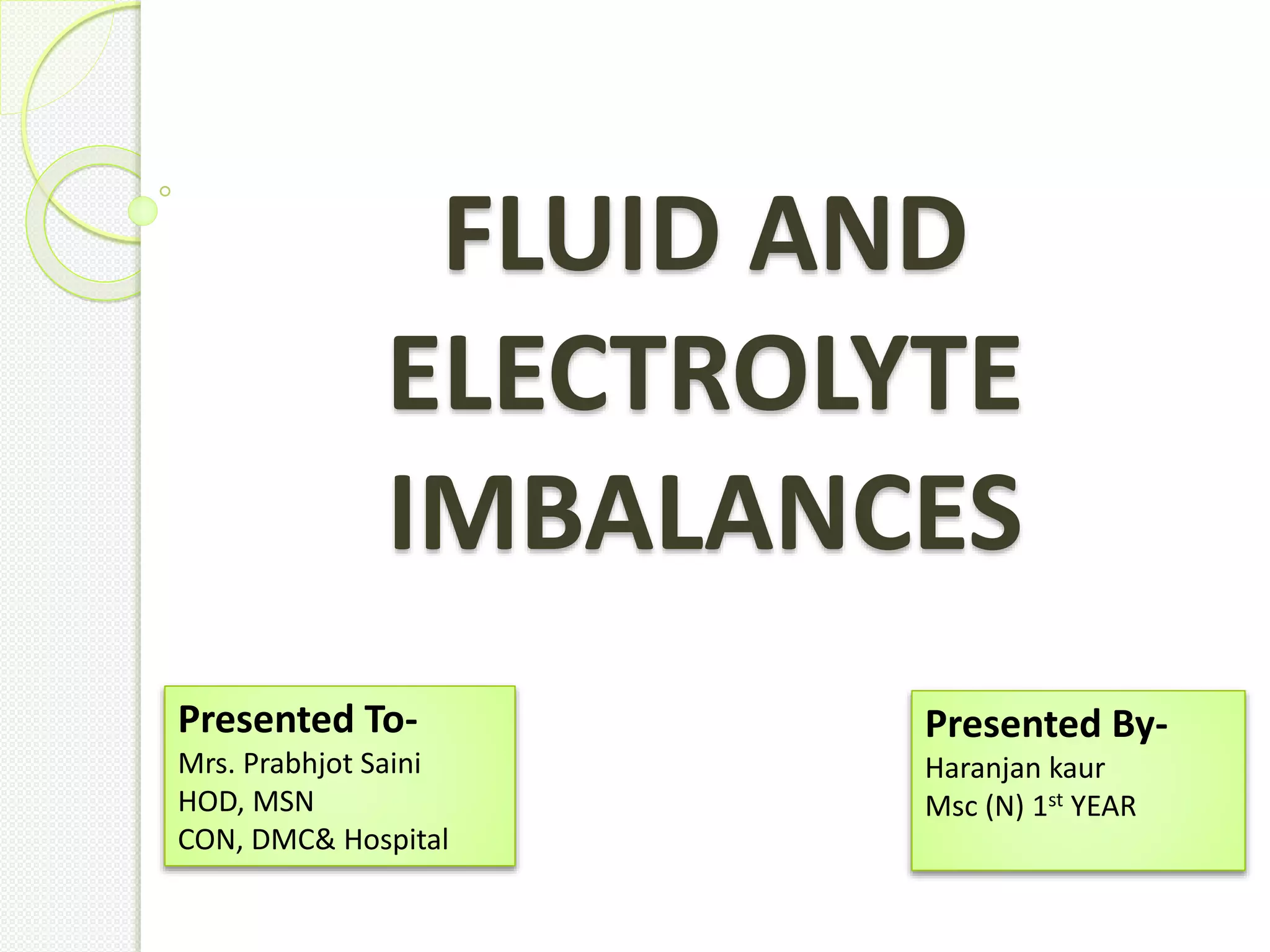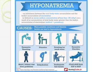 The document discusses fluid and electrolyte imbalances, emphasizing their importance for physiologic homeostasis and health outcomes. It covers body fluid compartments, mechanisms controlling fluid movement, fluid imbalances, clinical manifestations, and management strategies for both fluid volume deficit and excess. Additionally, it highlights the role of hormones and kidneys in regulating fluid balance, and the potential consequences of imbalances for various patient populations.
