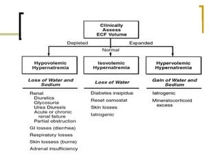 3) Treatment for abnormalities involves identifying the cause, restoring fluid and electrolyte deficits or excesses slowly and carefully based on symptoms and monitoring to prevent further complications.
