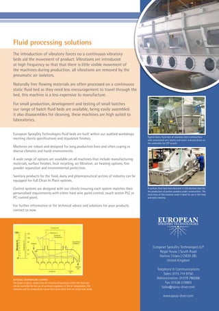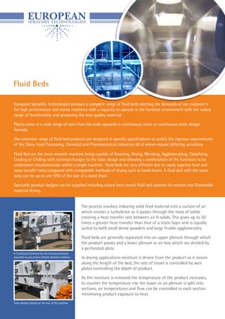 European SprayDry Technologies produces a wide range of fluid bed machines for industries such as dairy, food processing, chemicals, and pharmaceuticals. Fluid beds can perform various functions including drying, roasting, blending, and more. They are highly efficient due to superior heat and mass transfer rates compared to other drying methods. Specialized designs include closed circuit systems for drying solvents and flammable materials.