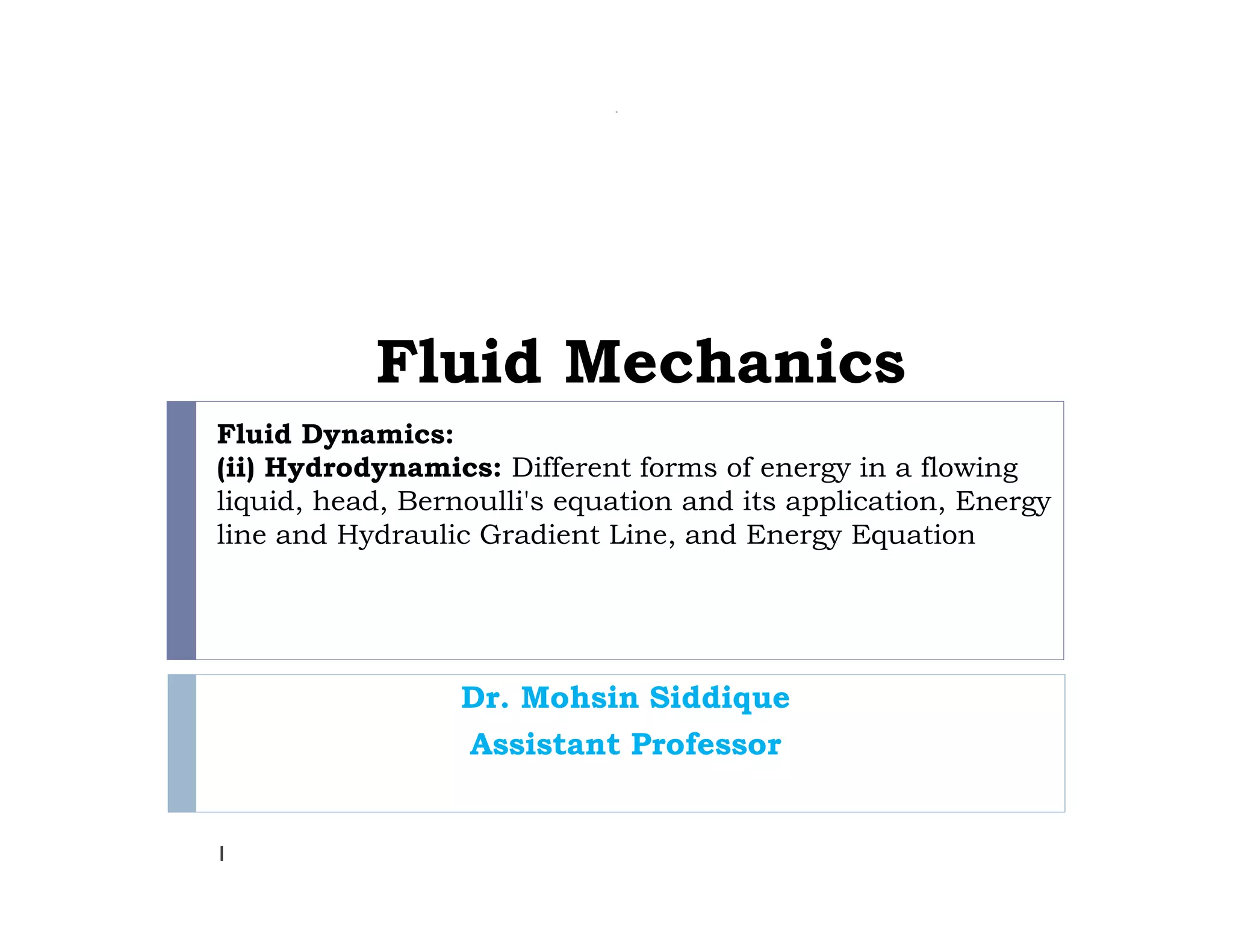 This document discusses fluid dynamics and Bernoulli's equation. It begins by defining different forms of energy in a flowing liquid, including kinetic energy, potential energy, pressure energy, and internal energy. It then derives Bernoulli's equation, which states that the total head of a fluid particle remains constant during steady, incompressible flow. The derivation considers forces acting on a fluid particle and uses conservation of energy. Finally, the document presents the general energy equation for steady fluid flow and the specific equation for incompressible fluids using the concepts of total head, head loss, and hydraulic grade line.