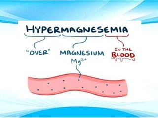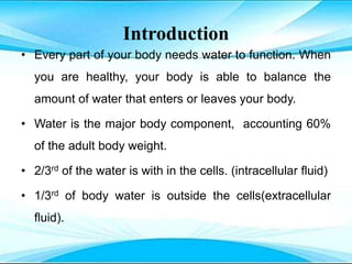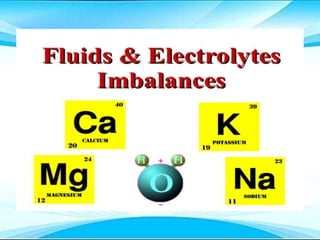 This document discusses fluid and electrolyte imbalances. It begins by explaining that water makes up 60% of the adult body weight and is divided between intracellular and extracellular fluid. The five major types of fluid imbalances are then defined as extracellular fluid volume deficit, intracellular fluid volume deficit, extracellular fluid volume excess, intracellular fluid volume excess, and extracellular fluid volume shift. Causes, signs and symptoms, and treatment approaches are provided for each type of imbalance. Common electrolyte imbalances like hyponatremia, hypernatremia, and hypokalemia are also explained.