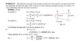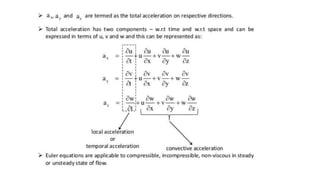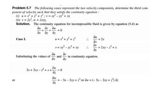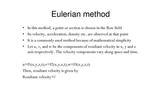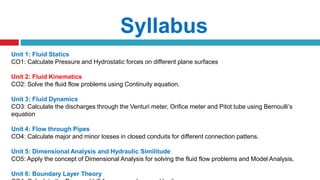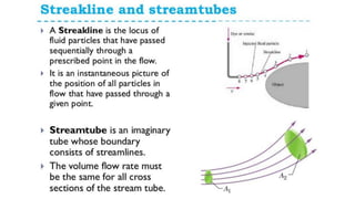 This document provides an overview of fluid kinematics, which is the study of fluid motion without considering forces. It discusses key concepts like streamlines, pathlines, and streaklines. It describes Lagrangian and Eulerian methods for describing fluid motion. It also covers various types of fluid flow such as steady/unsteady, laminar/turbulent, compressible/incompressible, and one/two/three-dimensional flow. Important topics like continuity equation, velocity, acceleration, and stream/velocity potential functions are also summarized. The document is intended to outline the syllabus and learning objectives for a course unit on fluid kinematics.