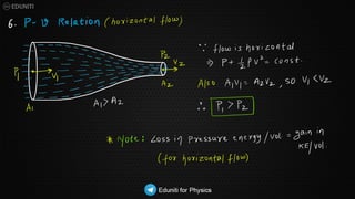 This document provides an overview of key topics in fluid mechanics, including different types of fluid flow, the Reynolds number, assumptions about ideal fluids, equations for continuity, Bernoulli's equation, relationships between pressure and speed, laws governing speed of efflux, calculations for vessel emptying time and thrust, and the venturimeter instrument. The accompanying YouTube playlist and image credits are also noted.