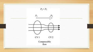 This document discusses compressible and incompressible fluids. Compressible fluids have variable density and include gases, while incompressible fluids have constant density and include liquids. The Mach number is defined as the ratio of flow speed to the speed of sound. Flow becomes compressible when the Mach number exceeds 0.3. Two example problems are included calculating Mach number and flow speed given the other value.