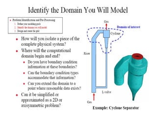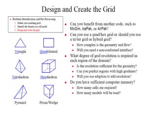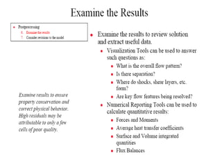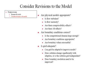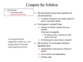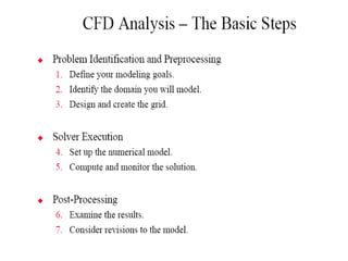 The document provides an overview of Computational Fluid Dynamics (CFD), detailing its definition, importance, and applications across various industries, including aerospace and biomedical fields. It discusses how CFD complements experimental and theoretical approaches by providing valuable data for engineering and research, as well as outlining the process of numerical modeling through governing equations. Additionally, it addresses the advantages and limitations of CFD, emphasizing its role in enhancing design and analysis despite potential physical and numerical inaccuracies.