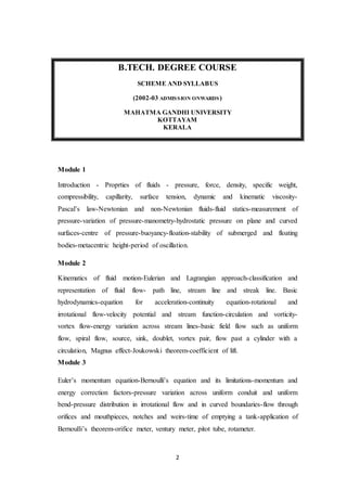The document outlines a comprehensive syllabus for a B.Tech degree course in Fluid Mechanics at Mahatma Gandhi University, covering key concepts such as fluid properties, fluid motion kinematics, and equations of motion. It addresses topics like viscosity, pressure measurements, Bernoulli's theorem, and flow through pipes, including laminar and turbulent flow. The syllabus also delves into advanced concepts like non-Newtonian fluids, surface tension, capillarity, and the principles of hydrodynamics.