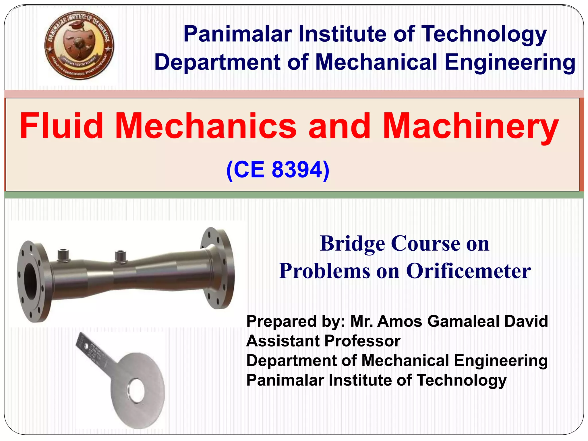 This document provides an overview of orificemeters and their use in measuring fluid flow. It discusses how orificemeters work by using an orifice plate with a circular hole to cause a pressure drop according to Bernoulli's equation. The rate of discharge is calculated using the orifice diameter and upstream and downstream pressures. Examples are given of orificemeter setups in laboratories and their advantages over venturimeters in being cheaper while still providing accurate flow measurements.