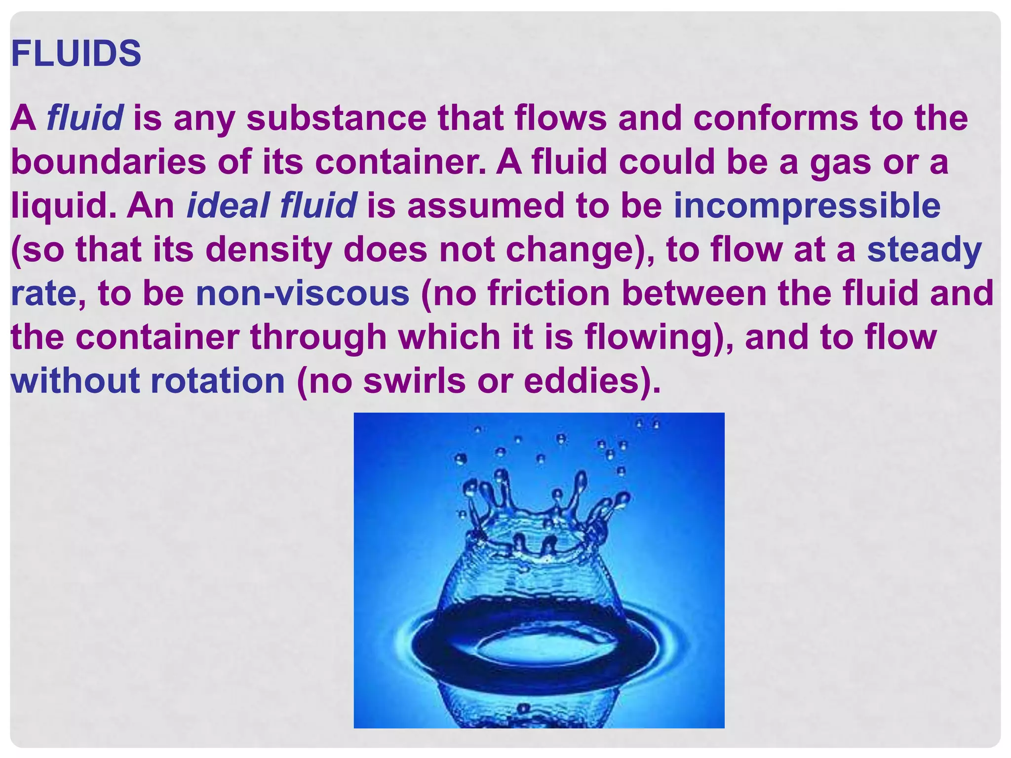 2. Key definitions include: density is mass per unit volume, pressure is force per unit area, gauge pressure measures pressure differences while absolute pressure includes atmospheric pressure, Pascal's principle states pressure changes are transmitted equally in all directions through a confined fluid.
