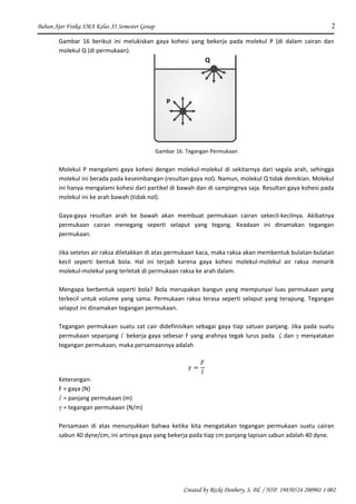 Dokumen tersebut membahas materi pelajaran fisika tentang fluida statis dan dinamis untuk siswa SMA kelas XI semester genap, mencakup konsep tegangan permukaan, meniskus, kapilaritas, dan viskositas beserta contoh soalnya.