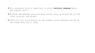 A fluidized bed reactor uses gases as a fluidizing media to fluidize a solid catalyst bed for solid gas reactions. Finely divided catalyst particles are contained in a cylindrical vessel with a grid at the bottom to support the bed. Fluidizing gases enter through the grid to fluidize the bed and ensure sufficient pressure drop across the grid to avoid catalyst seepage below the support.